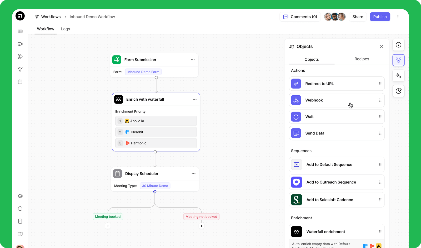 Default consolidates enrichment, lead scoring, routing, sales scheduling, and CRM updates into one visual workflow. GTM teams can launch advanced automations—like round-robin scheduling for only ICP-matched leads—without engineering support.
