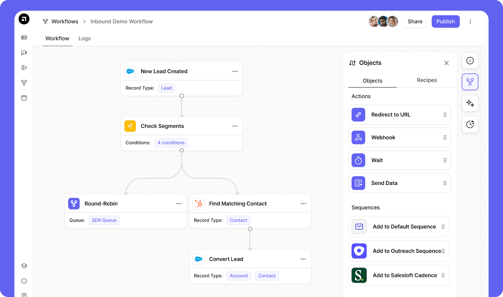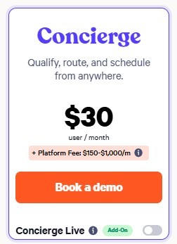 Concierge qualifies, routes, and schedules inbound leads directly from web forms. It supports enrichment, routing based on form and CRM data, spam filtering, and multi round-robin logic.Â