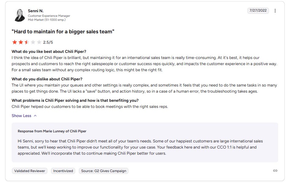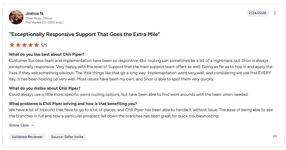 Chili Piper earns strong ratings on platforms like G2. Reviews praise speed-to-lead and scheduling efficiency, while common concerns focus on pricing scalability and Salesforce complexity.