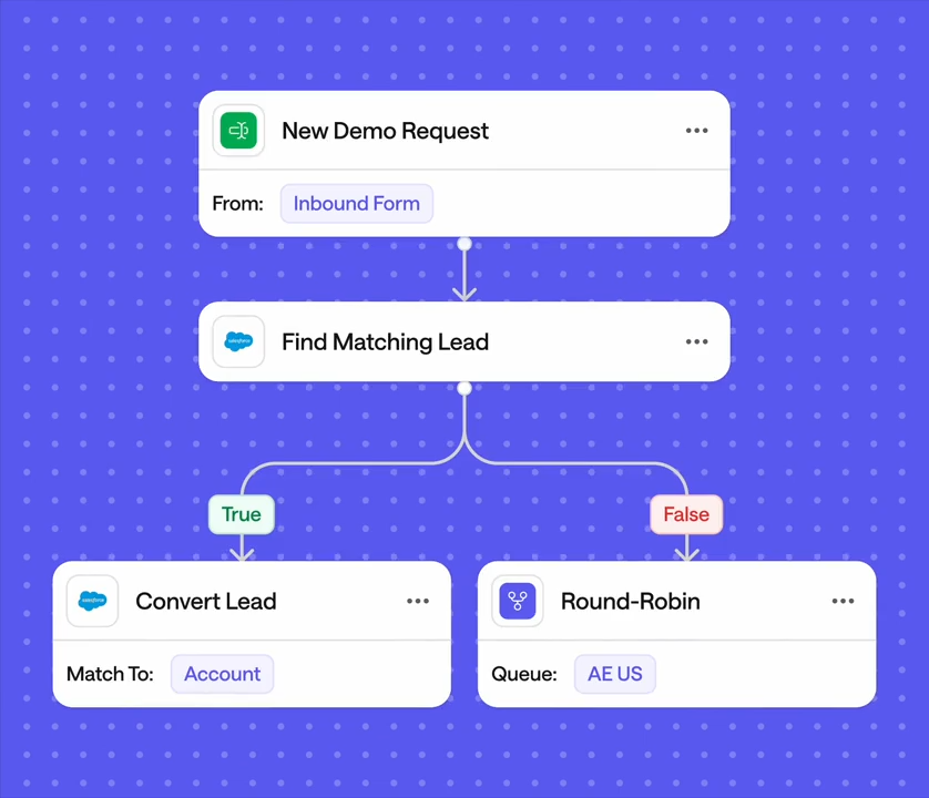 - Connect routing, scheduling, and CRM writeback in one workflow, so the right AE is assigned, meetings book fast, and handoff context lands in structured fields automatically.