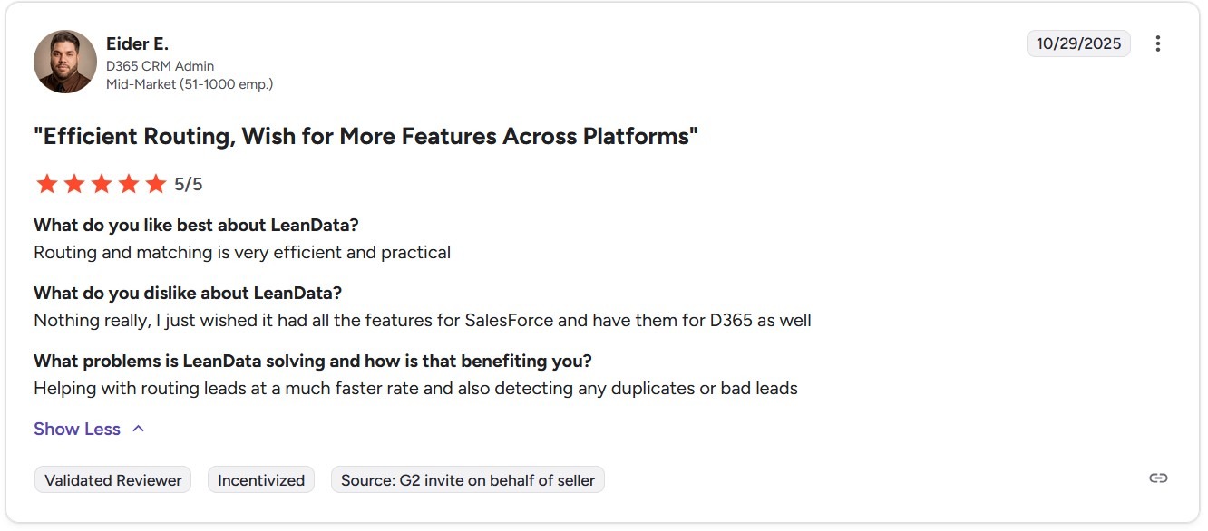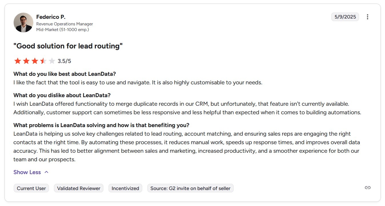 One reviewer notes that LeanData delivers efficient lead routing, solid matching, and reliable duplicate detection, helping teams process leads faster while maintaining cleaner CRM data.