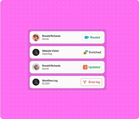 A single place to manage workflows across CRM, marketing automation, enrichment, intent, sales engagement, and CS systems. This reduces integration sprawl and makes it easier to understand and adjust how routing and follow-up actually work.