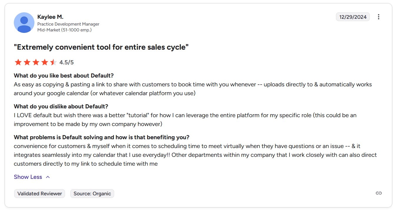 A reviewer notes that Default makes scheduling easy through simple booking links and calendar integration, improving convenience, with a request for more role-specific onboarding resources.