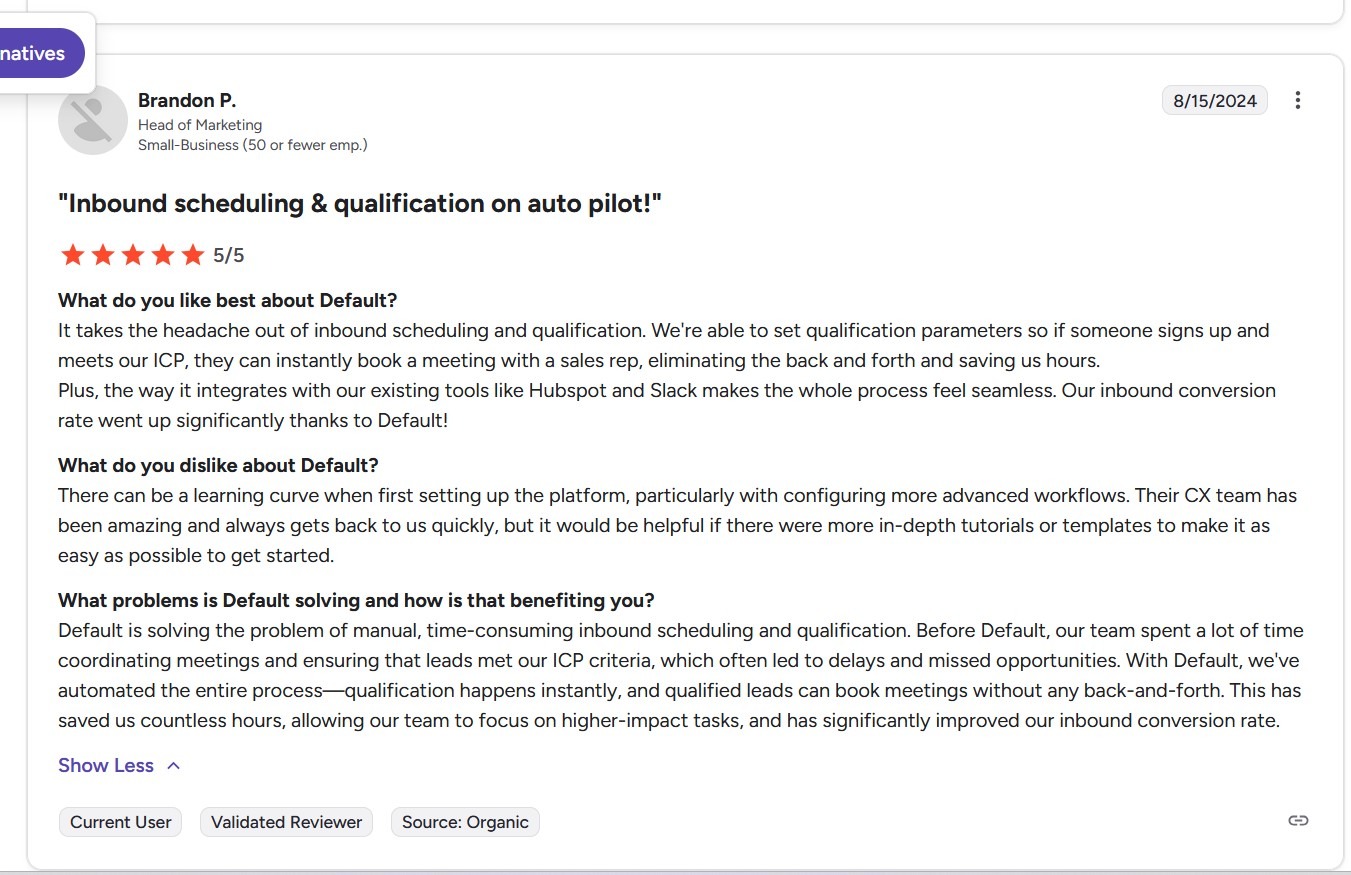 Customer reviews consistently highlight how Default improves scheduling efficiency and inbound qualification while reducing manual effort for revenue teams.