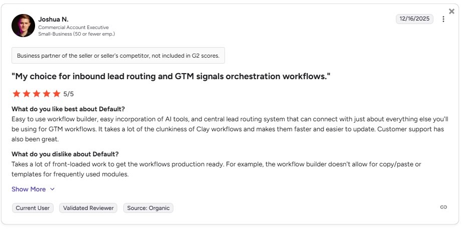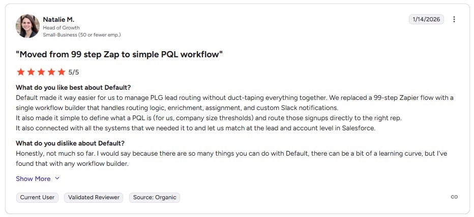 “Default made it way easier for us to manage PLG lead routing without duct-taping everything together. We replaced a 99-step Zapier flow with a single workflow builder that handles routing logic, enrichment, assignment, and custom Slack notifications”. - Natalie M., validated G2 reviewer