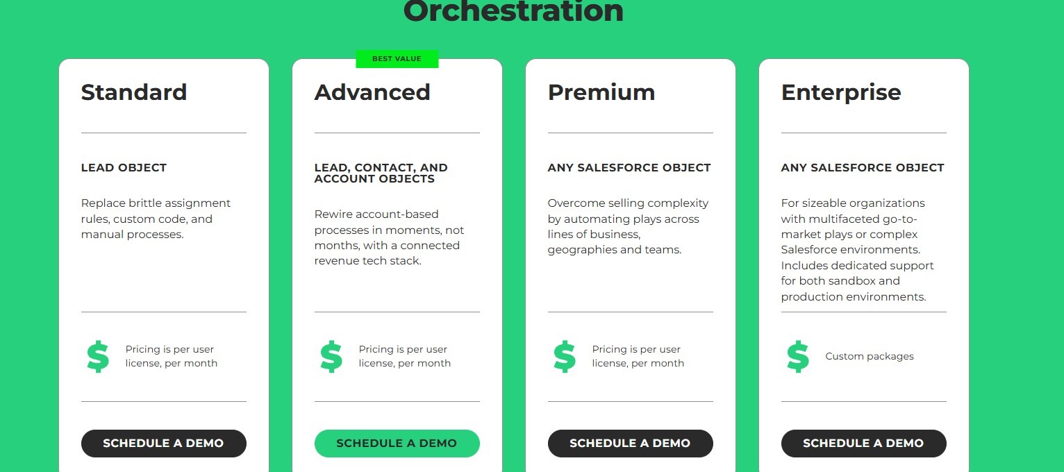 LeanData operates on custom enterprise pricing, typically based on Salesforce record volume, routing complexity, and feature tier.
