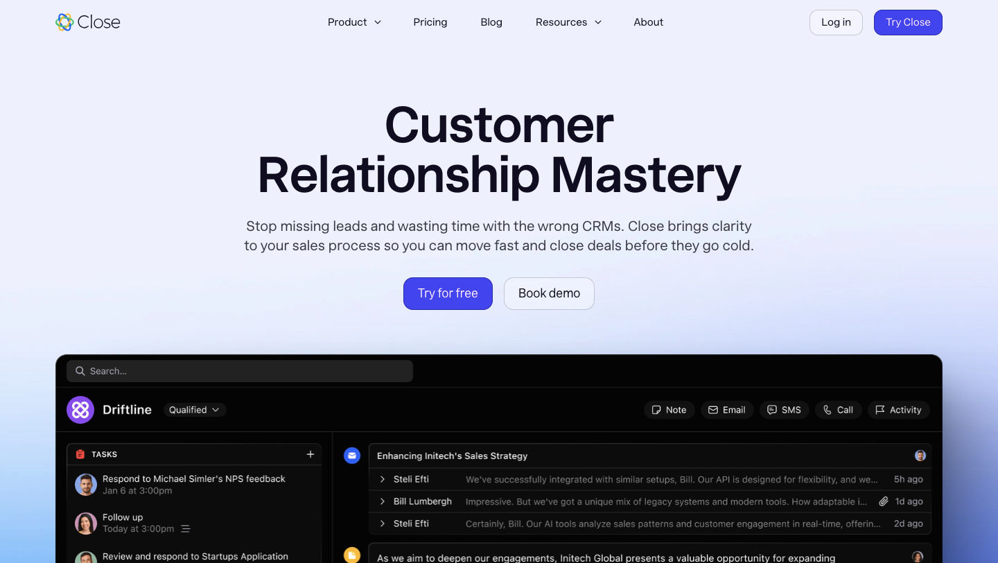 Close combines pipeline management with built-in calling, SMS, and email automation.