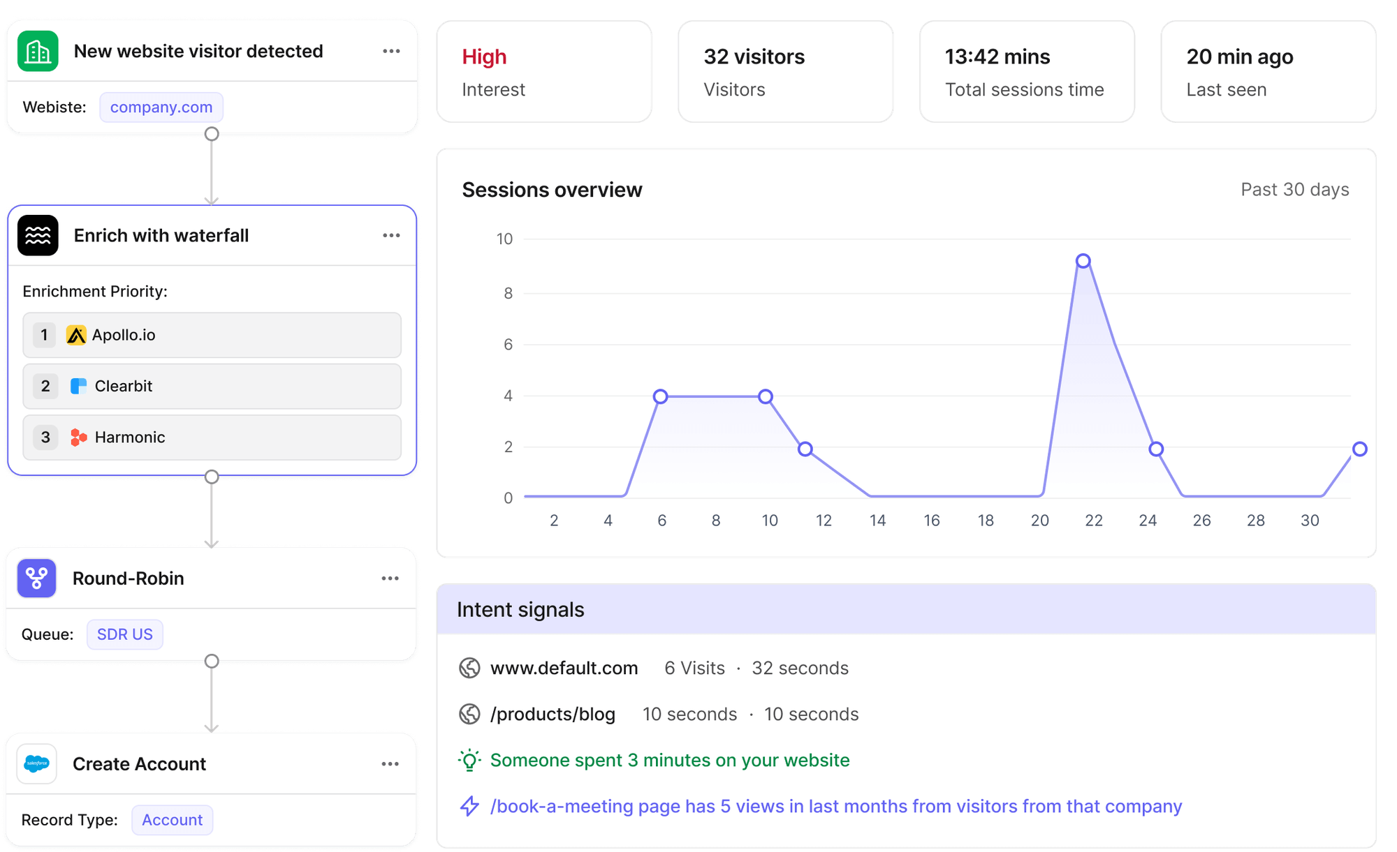 Enroll accounts into outbound sequences based on signals like demo requests or pricing page visits, improving timing and engagement. - Sales-to-customer success handoff