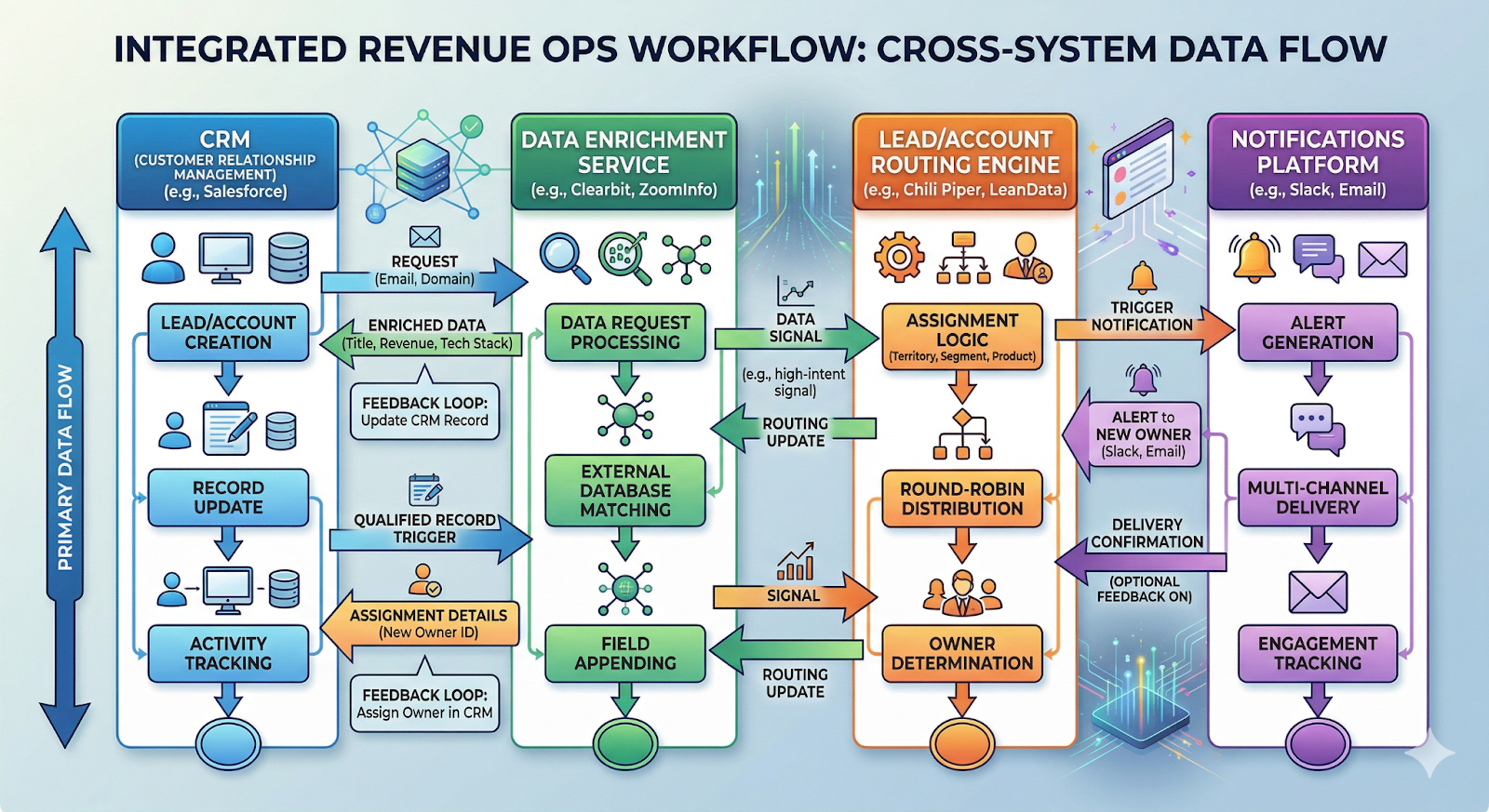 RevOps workflows don’t live in one tool. They span CRM, enrichment, routing, and engagement platforms.